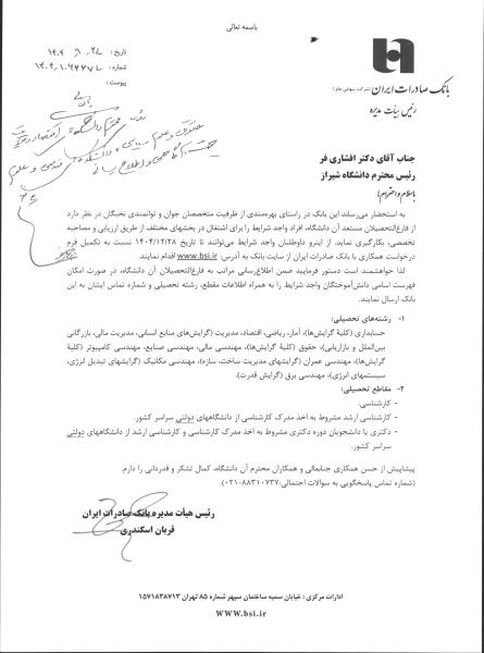 به استحضار می‌رساند این بانک در راستای بهره‌مندی از ظرفیت متخصصان جوان و توانمندی نخبگان در نظر دارد از فارغ‌التحصیلان مستعد آن دانشگاه، افراد واجد شرایط را برای اشتغال در بخش‌های مختلف از طریق ارزیابی و مصاحبه تخصصی، به‌کارگیری نماید. از این‌رو داوطلبان واجد شرایط می‌توانند تا تاریخ ۱۴۰۴/۱۲/۲۸ نسبت به تکمیل فرم درخواست همکاری با بانک صادرات ایران در سایت بانک به آدرس www.bsi.ir اقدام نمایند.