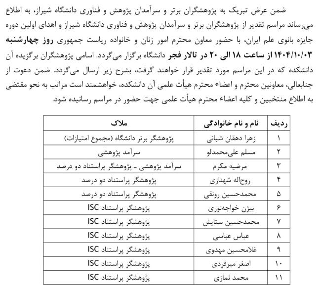 اسامی پژوهشگران برگزیده آن دانشکده که در این مراسم مورد تقدیر قرار خواهند گرفت، به شرح زیر ارسال می‌گردد. ضمن دعوت از جنابعالی، معاونین محترم و اعضای محترم هیأت علمی آن دانشکده، خواهشمند است مراتب به نحو مقتضی به اطلاع منتخبین و کلیه اعضای محترم هیأت علمی جهت حضور در مراسم رسانیده شود.