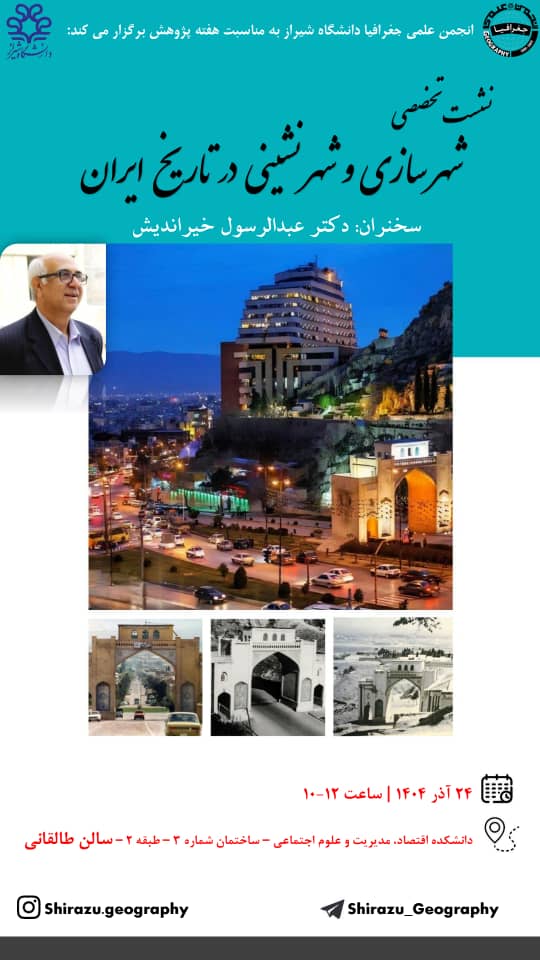 انجمن علمی جغرافیا به مناسبت هفته پژوهش برگزار می‌کند: نشست تخصصی "شهرسازی و شهر نشینی در تاریخ ایران" سخنران: دکتر عبدالرسول خیراندیش زمان: ۲۴ آذر ۱۴۰۴ | ساعت ۱۲_۱۰ مکان: دانشکده اقتصاد،مدیریت و علوم اجتماعی_ساختمان شماره۳_طبقه۲_سالن طالقانی