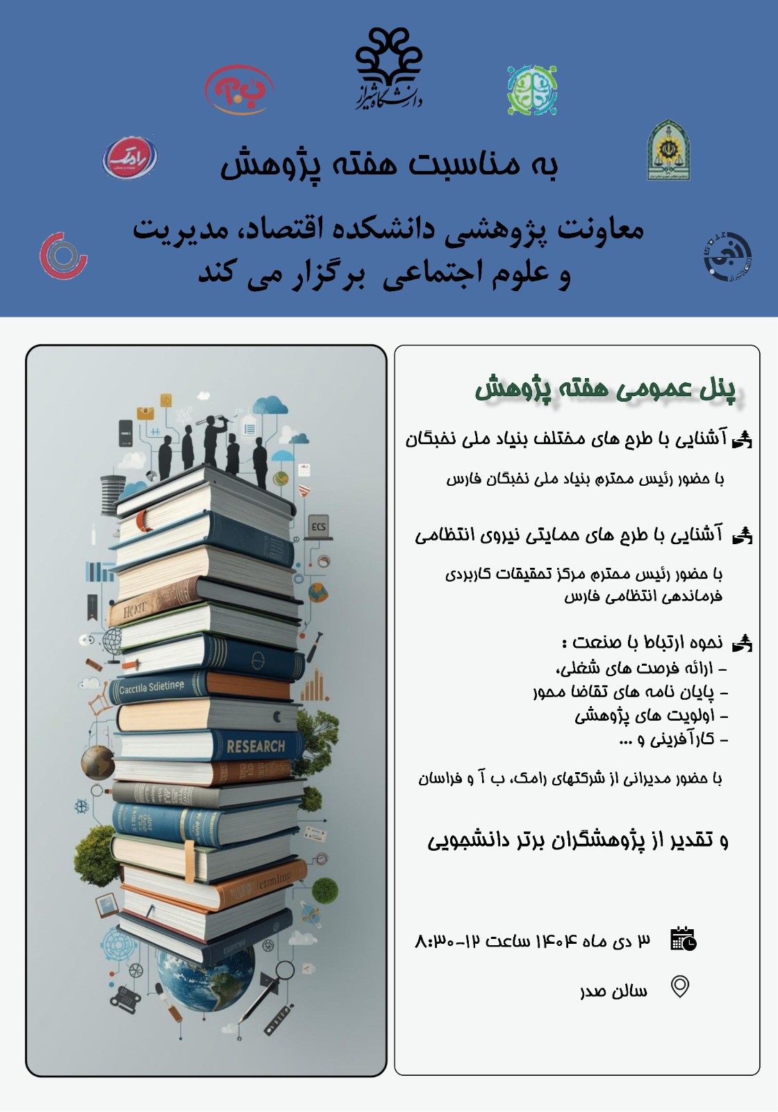 آیین گرامیداشت هفته پژوهش‌ و فناوری سال ۱۴۰۴ با همت استانداری فارس و دانشگاه شیراز برگزار می شود: نمایشگاه دستاوردهای پژوهش و فناوری دانشگاه‌ها و دستگاه‌های اجرایی استان تاریخ: 8 تا 10آذر ساعت بازدید: ۹ تا ۱۷ جشنواره تجلیل از پژوهشگران، فناوران،...