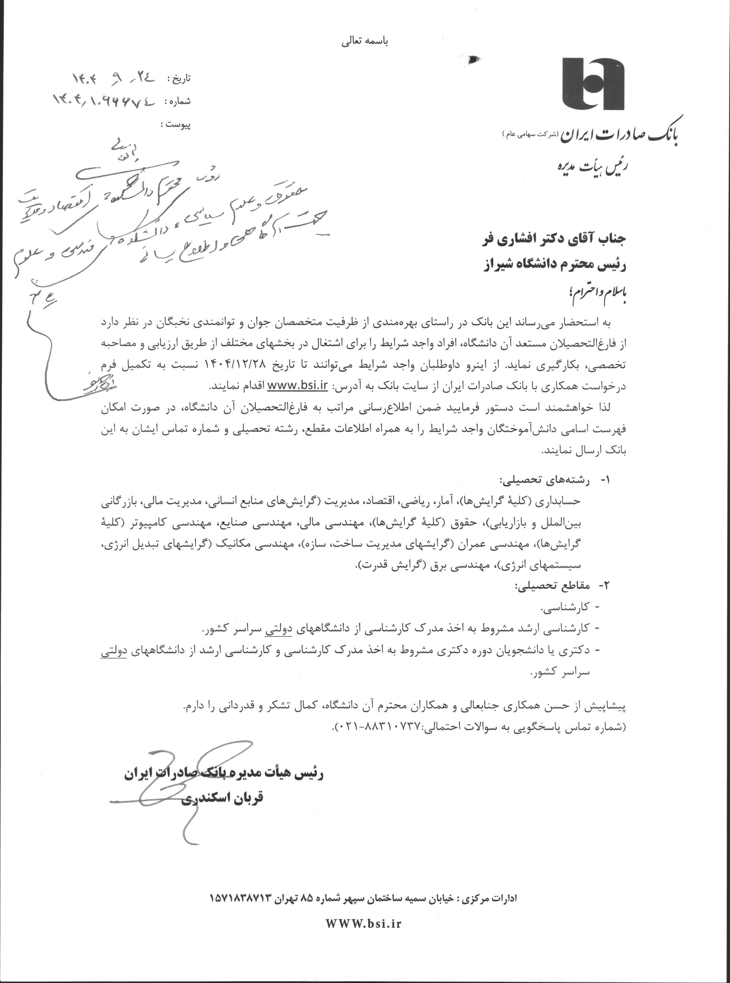 به استحضار میرساند این بانک در راستای بهرهمندی از ظرفیت متخصصان جوان و توانمندی نخبگان در نظر دارد از فارغالتحصیلان مستعد آن دانشگاه، افراد واجد شرایط را برای اشتغال در بخشهای مختلف از طریق ارزیابی و مصاحبه تخصصی، بهکارگیری نماید. از اینرو داوطلبان واجد شرایط میتوانند تا تاریخ ۱۴۰۴/۱۲/۲۸ نسبت به تکمیل فرم درخواست همکاری با بانک صادرات ایران در سایت بانک به آدرس www.bsi.ir اقدام نمایند.